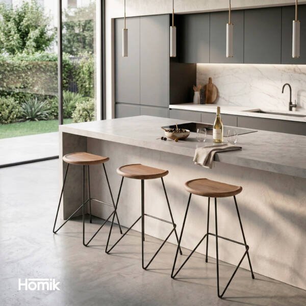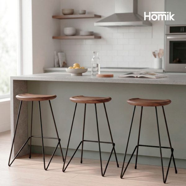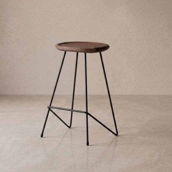 El butaco Montessori se caracteriza por su diseño innovador y con un estilo industrial que combina el metal y la madera NOGAL, su altura total es de 73cm ideal para barras de altura estándar 100cm a 110cms.
